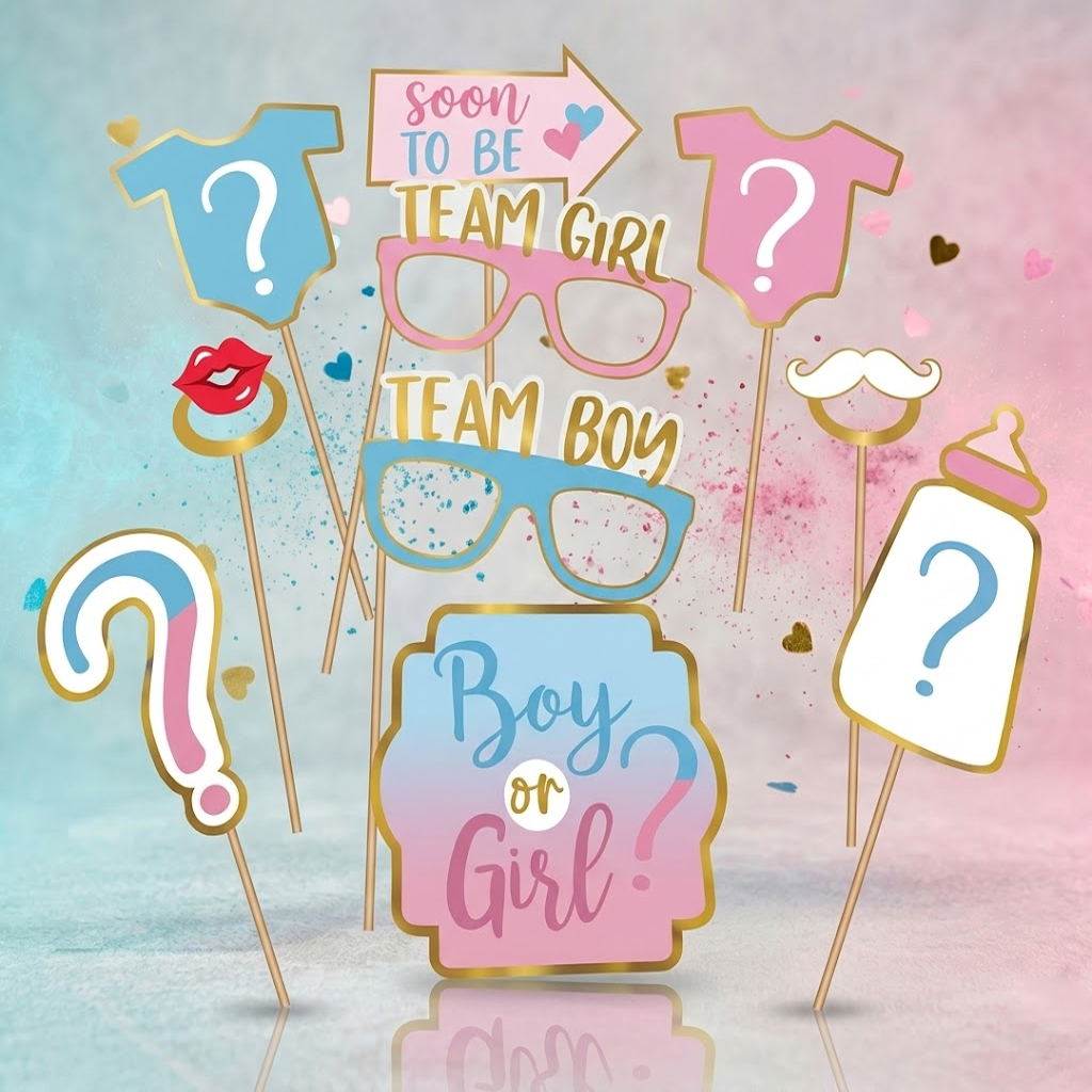 ¡Haz que tus fotos sean inolvidables! Este divertido set incluye 10 accesorios temáticos (Photobooth props) diseñados para animar tus capturas durante la revelación. Desde gafas de ‘Team Boy’ y ‘Team Girl’ hasta biberones y carteles de incógnito, estos accesorios son el detalle perfecto para que tus invitados interactúen y se diviertan frente a la cámara.