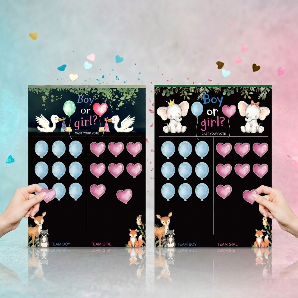¿Niño o Niña? ¡Haz tu apuesta! Nuestro Cuadro de Votaciones es la dinámica perfecta para romper el hielo en tu revelación de género. Permite que tus invitados voten por su bando favorito pegando stickers de corazones o globos en este hermoso tablero decorativo. Elige entre nuestros tiernos diseños de animales del bosque y haz que todos sean parte de la sorpresa.
