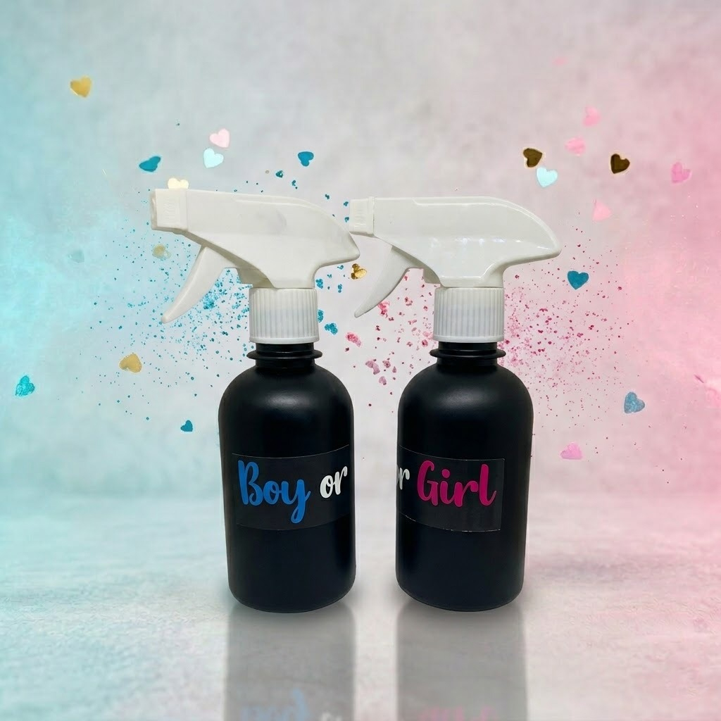 Envase Misterioso: El frasco es de color negro mate con etiquetas de «Boy or Girl», manteniendo el secreto del contenido hasta que se presiona el gatillo.